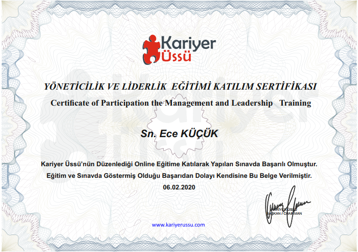 - Yöneticilik ve Liderlik Eğitimi Sertifikası